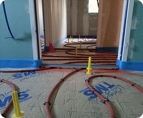 Coulage sur sol chauffant dans une extension à accès réduit. Intervention rapide et surface prête à carreler.
