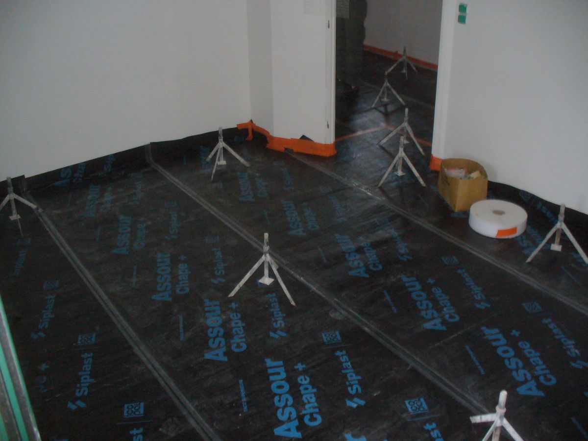 - Mise en œuvre de sous-couches résilientes (membranes acoustiques, plaques composites)
